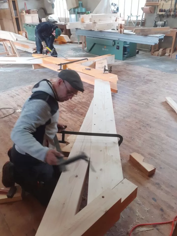 Zoomer 24-04-2023 Assemblage à blanc d'une ferme sur blochets en atelier ( Corbelin) avant levage sur le chantier à St Victor de Morestel